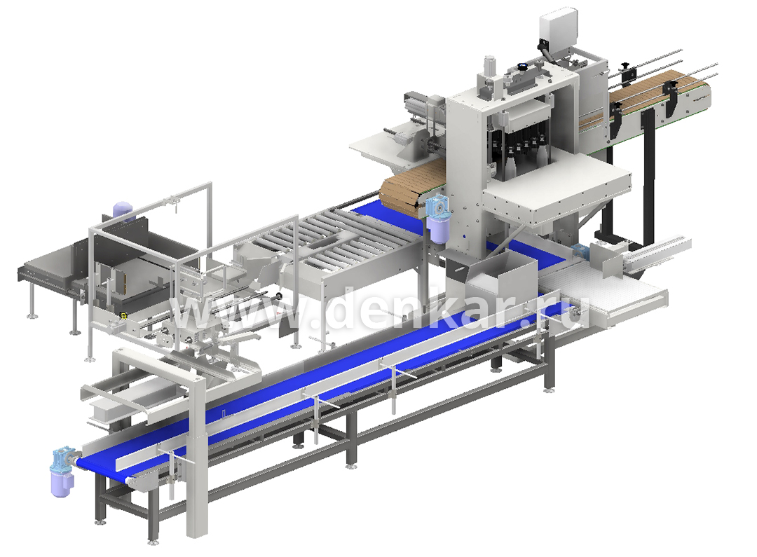 - Транспортер коробов цепной на 4 позиции короба, имеющий в составе устройство подворачивания верхних клапанов (подготовка к автоматической заклейке)